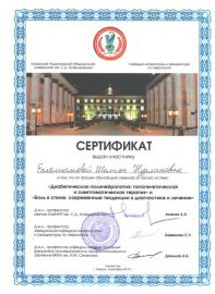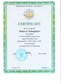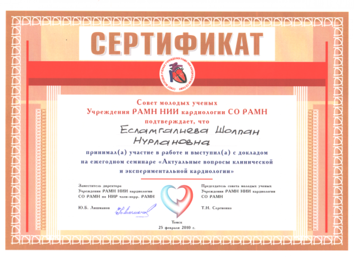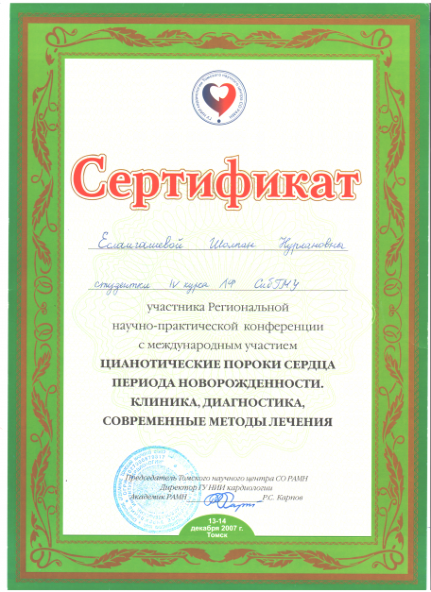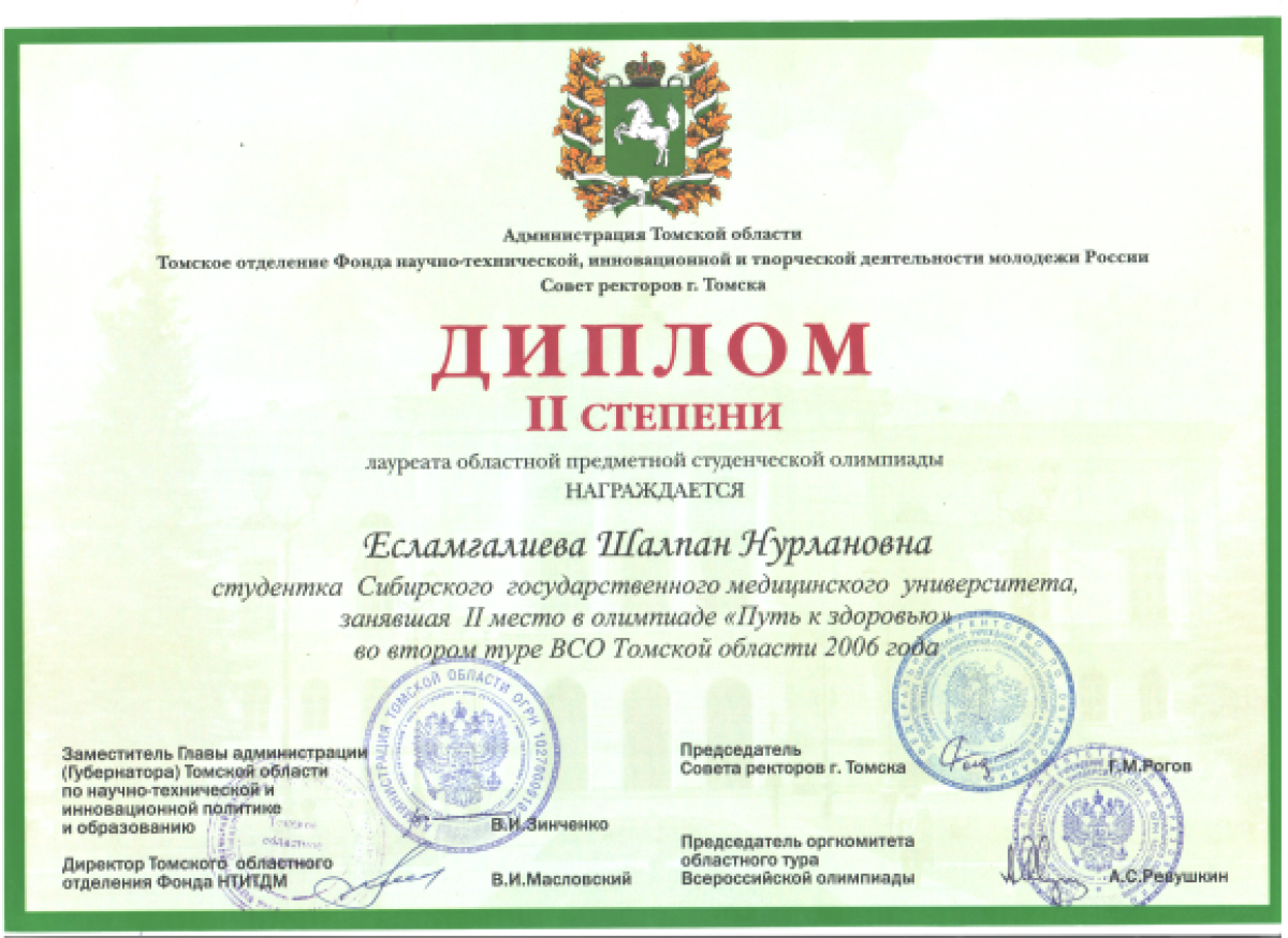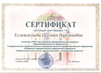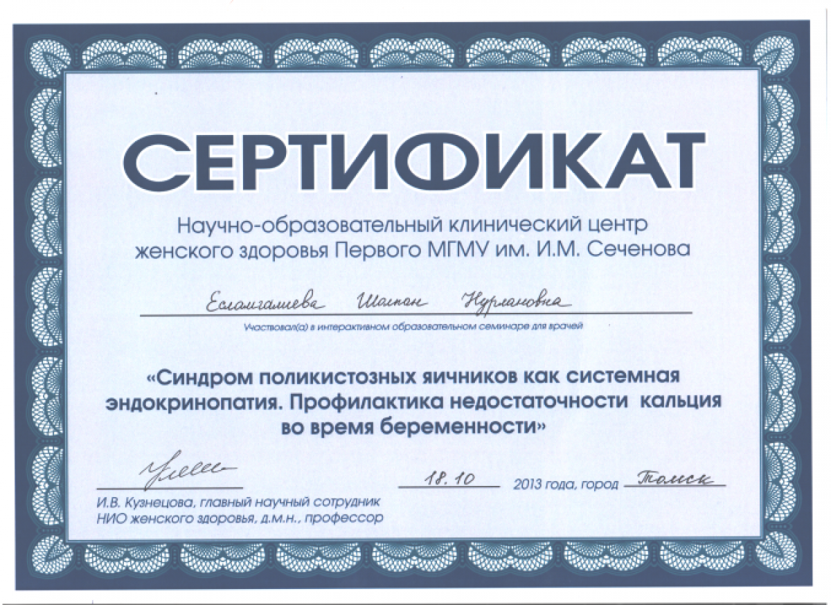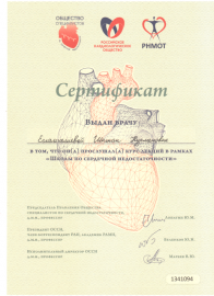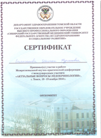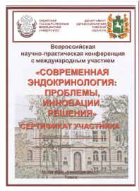 • 2010-2014 гг. – Сибирский государственный медицинский университет (Томск, РФ), ординатура (государственный грант), специальность «Эндокринология и диабетология» (диплом и действующий сертификат врача-эндокринолога);
