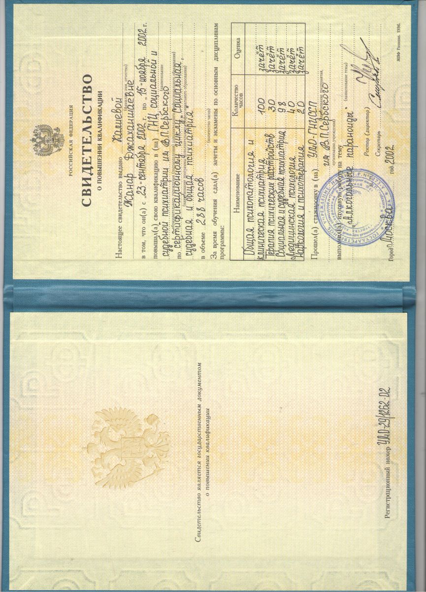 2009г. повышение квалификации в АГИУВ по циклу «Алкоголизм, наркомании, и токсикомании. Профилактика и лечение»