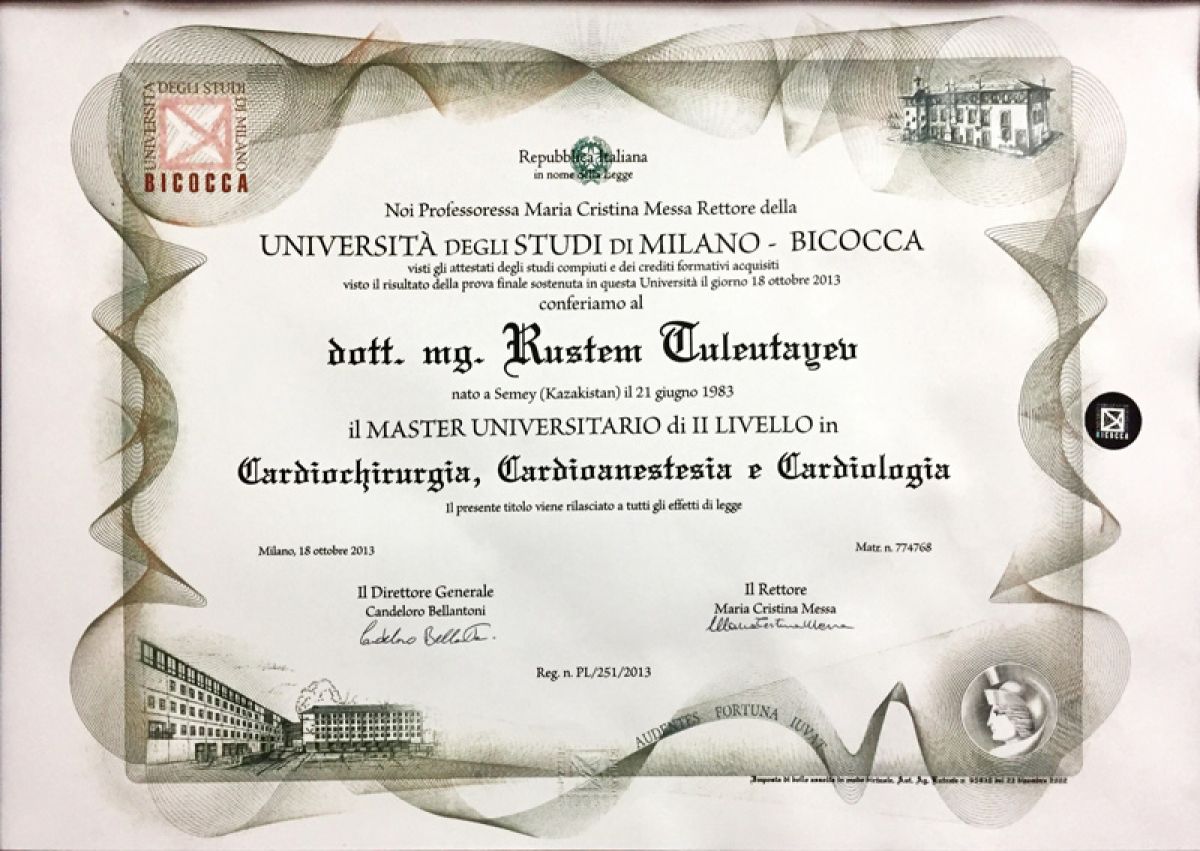 • 2012-2013 гг. – University Milano – Bicocca (Милан, Италия), магистратура по кардиохирургии, кардиологии, кардиоанестезиологии.