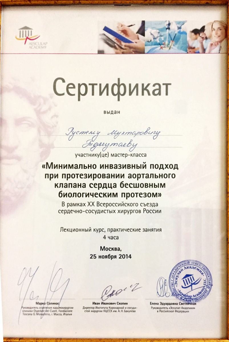 • 2014 г. – курсы по минимально инвазивной хирургии аортального клапана (Москва, РФ);