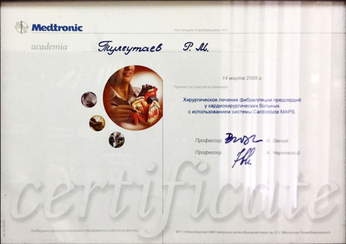• 2009 г. – курс усовершенствования по хирургическому лечению фибрилляций предсердий у кардиохирургических больных с использованием системы Cardioblate MAPS (Новосибирск, РФ);