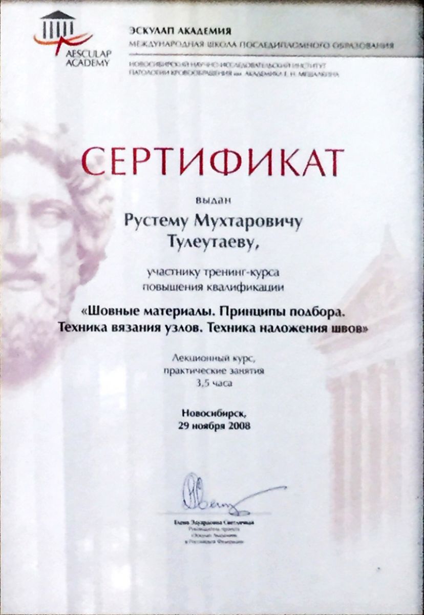 • 2008 г. – семинар-тренинг «Шовные материалы. Принципы подбора. Техника вязания узлов. Техника наложения швов. Эскулап – академия» (Новосибирск, РФ);