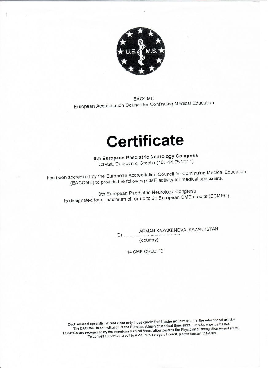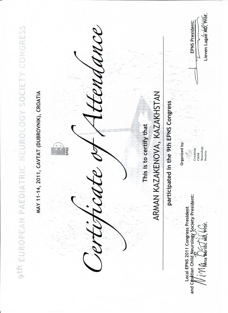 • 1997-1999 гг. – Алматинский государственный институт усовершенствования врачей (АГИУВ), кафедра детской неврологии, клиническая ординатура.