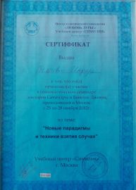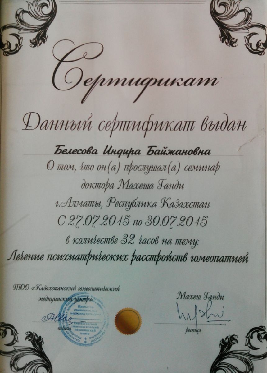 2011 ж. – дәрігер-гомеопаттар үшін классикалық гомеопатия бойынша біліктілікті арттыру (Мәскеу, РФ);