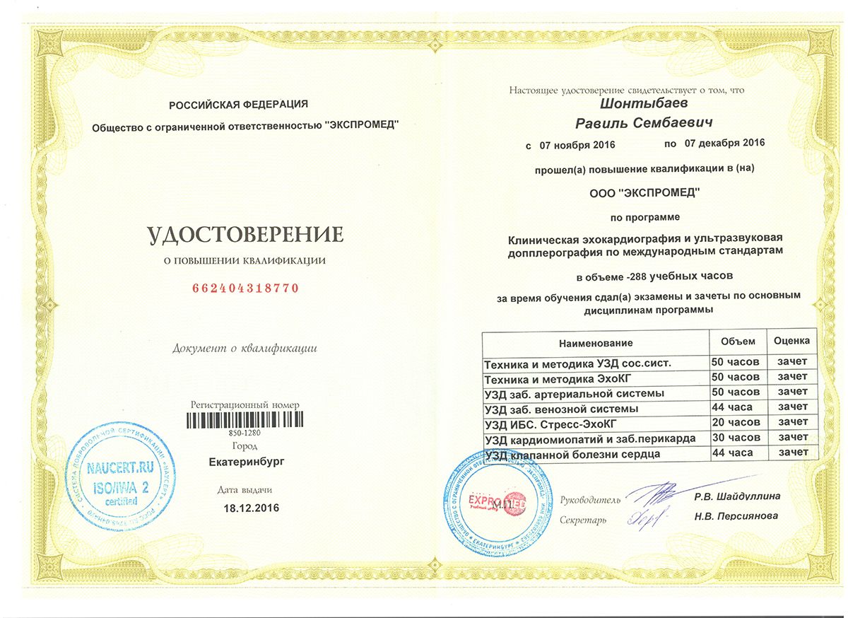 - 2016 ж. – «Клиникалық эхокардиография және халықаралық стандарттарға сай ультрадыбыстық допплерография»;